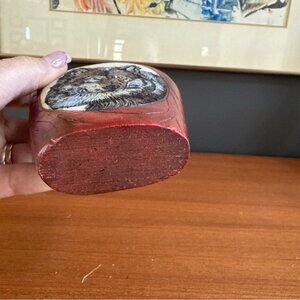 Explore the wild side of your decor with this unique Vintage Hand Painted Wolf Carving Resin Red Bottle Vase. A remarkable piece that combines the rugged beauty of nature with the timeless art of craftsmanship, this small canteen is adorned with a meticulously hand-painted wolf design, giving it a distinctive and enchanting appeal.