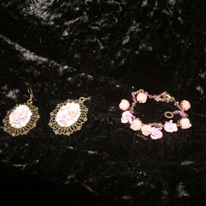 Broach or locket style handmade floral hanging pierced earrings in pale pinks and green with a matching bracelet. Moldovian artistry.
