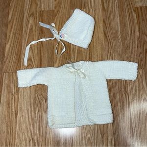 VINTAGE HANDMADE KNITTED WHITE BABY SWEATER AND BONNET NEWBORN COTTAGE CORE