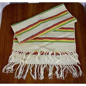 AWESOME VINTAGE HANDWOVEN NATURAL WOOL GREEN RED YELLOW BROWN STRIPED FRINGE DRESSER SCARF TABLE RUNNER Size 13 1/2" x 36" 100% WOOL;
