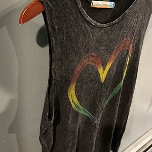 Bohemian Vintage Havana Heart Graphic Tank Top. This cool tank top from Vintage Havana features a distressed, charcoal grey fabric for a worn-in look. It has a vibrant graphic of a heart outlined in rainbow colors (red, yellow, green, blue) on the front. With a relaxed, sleeveless fit, it's perfect for a casual, artistic, and effortlessly cool vibe!