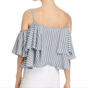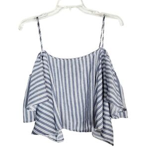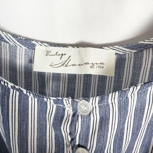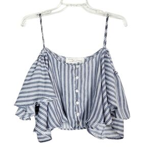 Vintage Havana cold shoulder cropped top. Blue and white stripes. Faux button detail on front. Fun ruffle detailing. Cute beachy vacation vibe.