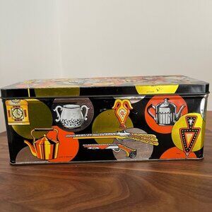 Huntley Boorne & Stevens vintage biscuit tin with a hinged lid, made in England. Designs on the tin include a trumpet, clock, tea pot, tea kettle, flintlock rifle. Yellow, orange, gold and white on a black background. Small printing says in HB&S in , in Antiques in , the numbers in 1498/4304 in and in Made in England in .