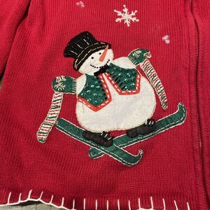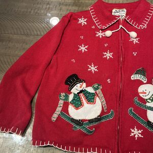Embrace the festive spirit with our Vintage Heirloom Collection ugly Christmas Sweater. This cozy cardigan features a charming snowmen theme, full of holiday cheer. The vibrant red color complements the whimsical design, making it a perfect choice for your seasonal gatherings or casual outings. Crafted for comfort and style, this zip-up sweater is sized XL, ensuring a generous fit for the woman on the go. The sweater's regular size type promises a relaxed and comfortable wearing experience, ideal for staying warm while celebrating the most wonderful time of the year.
