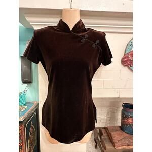 CHOCOLATE BROWN VELVET SHORT SLEEVED TOP FROM HENRI BENDEL. ASIAN STYLE FROG CLOSURES. MEASUREMENTS IN PHOTOS.