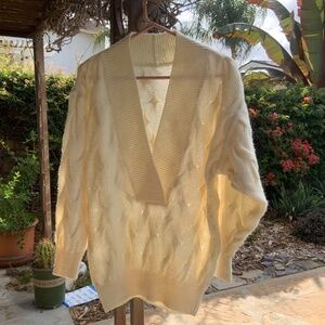 Light-weight, very soft, fluffy sweater with mohair and barely noticible thin Lurex thread accents. Loose fit. Attention to detail