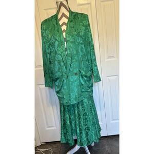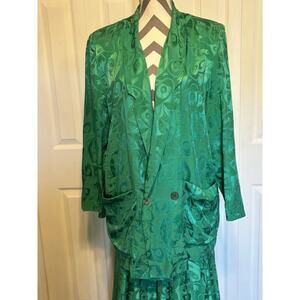 This vintage skirt and blazer set from Cassant is a must-have for any fashion-savvy woman. The set features a beautiful green patterned flare skirt and a matching blazer with pockets and shoulder pads. The skirt and blazer are made from luxurious silk satin material and are perfect for any occasion, from weddings to business meetings.