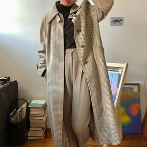 vintage pure wool houndstooth pattern long coat/ cream and tan colored perfect neutral tone/ leather buttons and unique collar design/ two deep pockets/ drop shoulder design no shoulder pads/ such a well made beautiful piece/ in like new condition/ would fit s-m shown on size 0 model