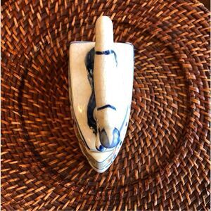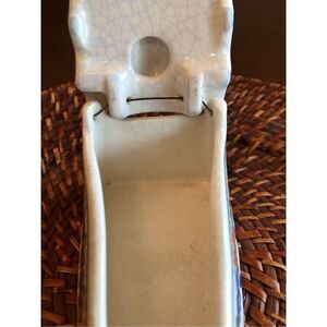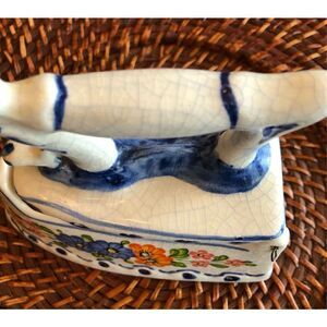 Cute and unique, this decorative porcelain jewelry box/trinket box gives a French Country vibe to your home. It’s Inspired by an old coal iron with a hinged lid, held by a small copper wire. It’s 6” x 5.5” x 3”. There is some crackling, but there are no cracks nor chips. The bottom is signed “Stublu” or “Stubtu”.  It’s obvious this wasn’t a mass-produced piece. It’s in beautiful condition. I think it would be super cute with a small plant (real or fake) in it with the top propped open. I don’t know its age, but I don’t remember when it wasn’t in my sisters lovely home. So pretty! 💙