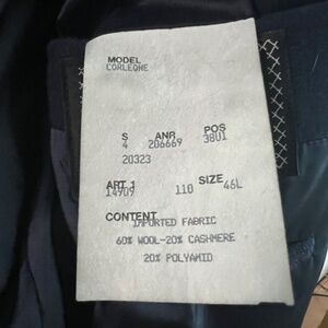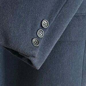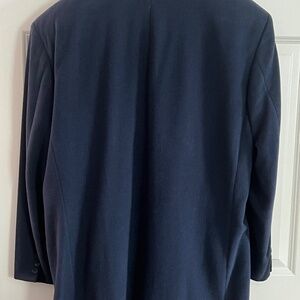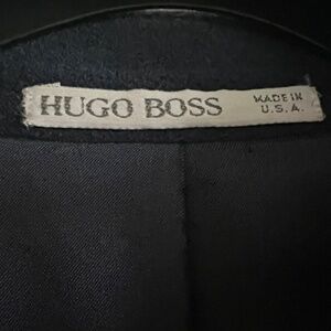 A beautiful Vintage Hugo Boss blue blazer in excellent condition. Model: Corleone. Single-breasted, ventless with notch collar. FABRIC: 60% Wool, 20% Cashmere, 20% Polyamide. Slight padding on the shoulders. Measurements: Back – from top of collar to hem is 34". Sleeve – from shoulder point to cuff is 24-1/4". Chest – from armpit to armpit is 23". Made in USA.