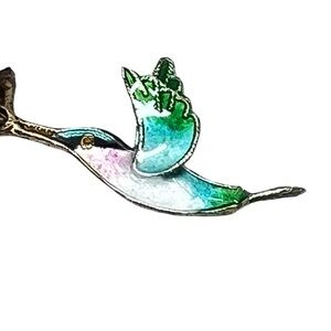 These handmade Hummingbird Earrings are a charming celebration of nature. They feature a delicate cloisonne enamel 3D hummingbird in shades of blue. green and white. in mid-flutter sipping nectar from a blue flower with green leaves. The gold-tone dangle wires and two-inch length add elegance, making them perfect for nature lovers, bird enthusiasts and art lovers.