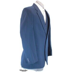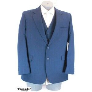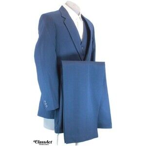 The Vintage Haggar 3 Piece Suit in Navy Blue Pinstripe is a stylish and sophisticated addition to any man's wardrobe. Made from polyester fabric with a rayon blend, this suit features a classic flat front design and a regular fit. The three-button jacket with a notch lapel and single vented back adds a touch of elegance to the ensemble, making it suitable for a variety of occasions from formal events to casual outings. This timeless suit from the United States is a perfect choice for those who appreciate a retro, classic, or preppy style.