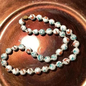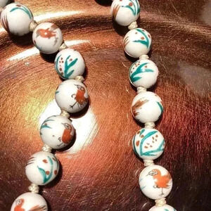 VINTAGE Hand Knotted 24" RED BIRDS PORCELAIN Beaded Necklace. 41beads total