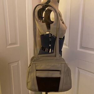 VINTAGE Tan and Brown Handmade Genuine Mexican Leather / Cowhide Shoulder Bag. Three zippered compartments. Zippered outer / side compartments. In excellent vintage used condition, from pet and smoke free home