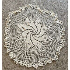 This is in very good condition and is beautiful. This vintage handmade Beige round crochet table doily measures 38 inches and is perfect for all occasions. Made of cotton crochet, this doily features an all-over pattern with a beauty theme. It is handmade in the American style and is iron-safe, washable, and recommended for hand wash only. The doily is a unique and charming addition to any collection of kitchen linens and textiles.