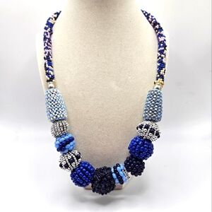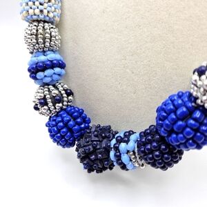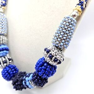 VINTAGE Handmade Blue & Silver Seed Bead Chunky Statement Necklace Boho