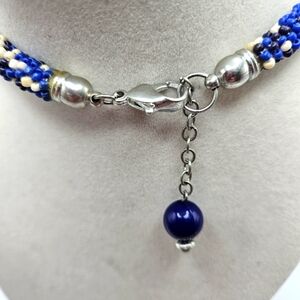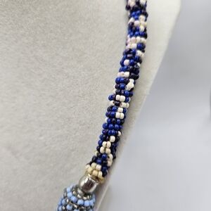Vintage handmade seed bead statement boho necklace. Seed beads in silver and blue. Silver-tone hardware. Adjustable lobster clasp back close. Necklace measures about 24-25.5" long. Purchased from an estate and no visible maker's mark. Excellent condition and smoke-free home.