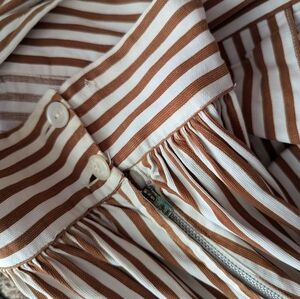 Keywords: striped, feminine, cotton, preppy, minimalist, conservative, ruffle, girlhoodcore, demure, Fall, Spring, Summer, modest, vintage, office, workwear, business casual, versatile, glam, fun, party, 50s, 60s