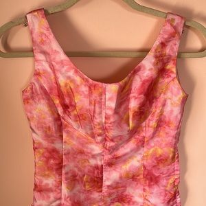 VINTAGE Handmade Pink Hawaiian Floral Mini Sleeveless Shift Dress. Size and material untagged, might fit a XXS/XS. Maybe a small teen or child. Please review measurements below. Painterly light pink and yellow floral satin-feel fabric. Bust darts and side zip. Tiny black dot/blemish pictured, not noticeable unless very close up. Adorable retro 60s summer look.