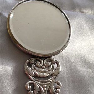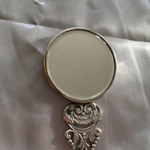 This is a vintage 1940s handheld pocket mirror from Denmark. Manufactured by Hans Jensen. Repossessed design. Measures 4.5 inches by 2.75 inches. Silver plate . Signed DENMARK. Such a lovely antique piece to own.