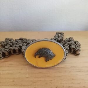 Vintage 1970s Easy Rider Style Motorcycle Belt from an Authentic Harley-Davidson Primary Drive Chain, Silver Tone, and the Golden Yellow Enameled and Metal Eagle Head Belt Buckle. The belt buckle is numbered #855. This belt is from my private collection from back in the day! Chain: 42" end to end, buckle adds 2", total length 44", single chain link width: 1/2". You can make the belt shorter with the hooks in the back, or remove some of the chain links. The belt is a RARE FIND, in very good condition, with some blemishes on the buckle. Additional photos provided upon request, and questions answered to the best of my ability. Smoke Free Home.