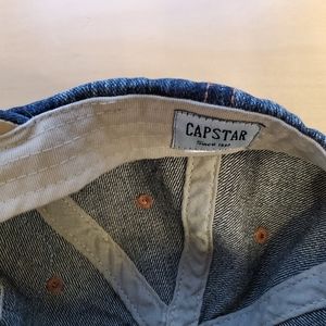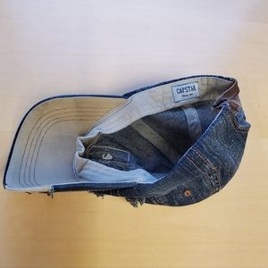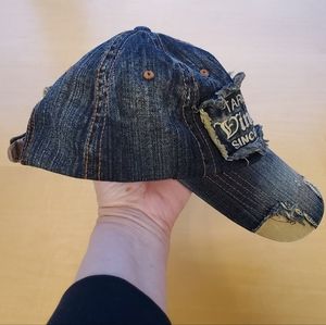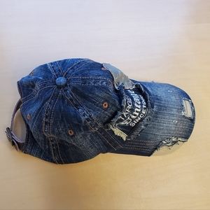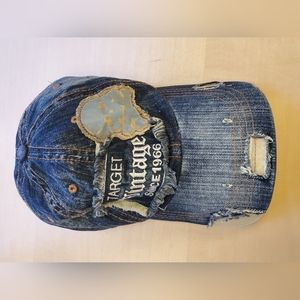 Cool looking cap/hat, denim, distressed pattern & patches, "washed-out" design, embroidery "Target VINTAGE since 1966" on the front, leather with buckle adjustable fastening in the back. Fits women's size Small. Excellent condition!