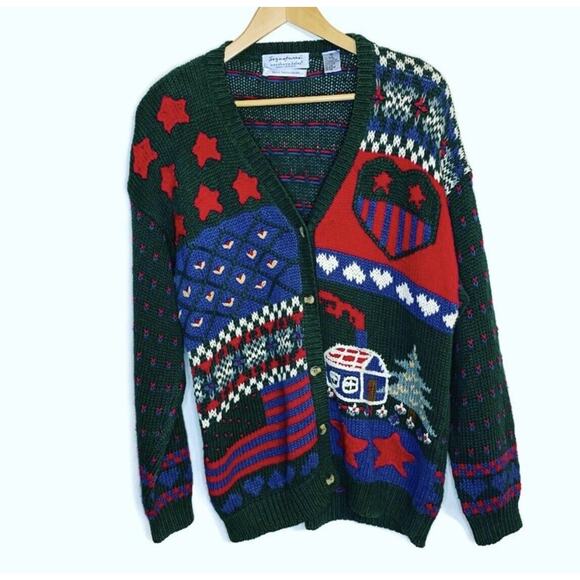 VINTAGE Heart Cardigan Sweater Large 80s Americana Granny Hand EmbroideredL