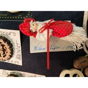1 handmade Doll pin - Red and white granny cap and apron, hand painted face, twine body, Signed Helen Piper, 1991
