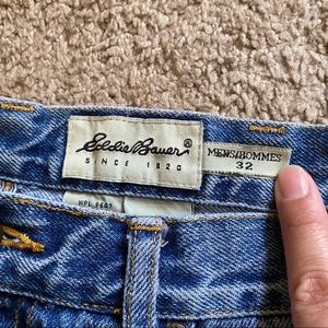 High rise jeans shorts altered from a pair of men’s (dad) shorts. Tag says “32” but fits like a size 6. There’s one small hole near the crotch but doesn’t show through.