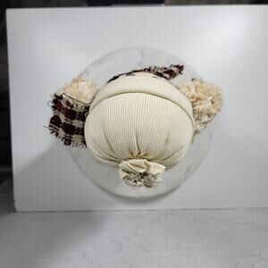 -Fluffy white coat and blue corduroy clothing with a white matching hat.