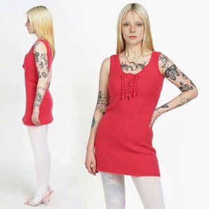 VINTAGE Hot Pink Wool Knitted Sleeveless Lace Up Mini Dress XS/S Barbie Babydoll Cute Boho Summer Festival Y2K Aesthetic