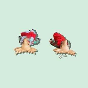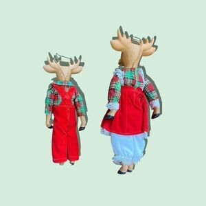 Set of porcelain reindeer in clothing. They measure approximately 8” long. They are in good condition, I did not find any chips or cracks. They have a string for hanging.