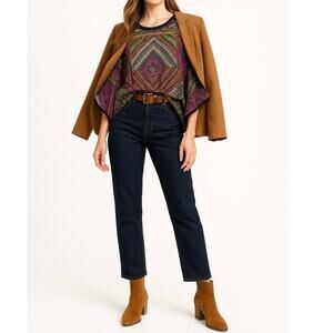 VINTAGE ICE Jewel Neckline Batwing Blouse | L | Aztec Print | Boho Festival Y2K