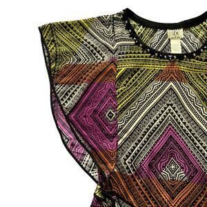 ICE batwing blouse in multicolor 100% polyester brings a vibrant bohemian spirit with its kaleidoscopic Aztec-inspired print in electric purples, sunset oranges, and neon greens. The batwing sleeves create dramatic movement with every step, while the lightweight, semi-sheer fabric adds an ethereal, free-spirited vibe. Perfect for summer festivals, beach vacations, or elevating your everyday looks with a punch of color and pattern.