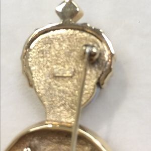 Gorgeous signed piece from iG, this sparkling brooch is a perfect addition to any wardrobe. It stands about 2.5" tall with sparkling blue sapphire on top, faux pearl face and on the tip with eyes enamel. I believe the figure is a Sultan, with a faux pearl face and on its side dangles a scimitar (curved sword). Beautiful high end designer piece- I believe the designer might be European. RARE AND ONE OF A KIND. Like new!