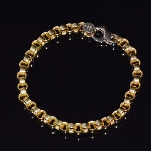 Gorgeous Italian designer 18K solid gold rolo link bracelet. This bracelet has a bold 5MM rolo link design crafted in solid 18K yellow gold with a contrasting white gold clasp. Extremely durable and heavy made, this bracelet is designed to last for generations. The radiant 18K gold shine along with high quality Italian craftsmanship will leave you speechless. Bracelet shimmers and sparkles with the slightest movement, which looks magnificent when worn.