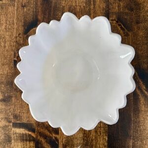 Add a touch of vintage charm to your table with this beautiful Indiana Glass Lily Pons milk glass bowl. This sunflower shaped bowl features a textured, pressed finish and is made of high-quality milk glass material. With approx. measurements of 7" diameter 3" depth and 1 lb weight. It is recommended to hand wash only this discontinued vintage bowl. Make it a unique addition to your vintage glassware collection today.