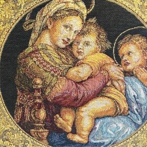 Add a touch of timeless elegance to your home with this stunning vintage Italian tapestry depicting the Madonna and Child. Purchased in Venice, Italy, this intricately woven artwork is beautifully framed and ready to hang.