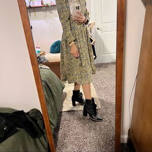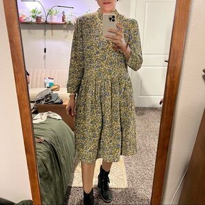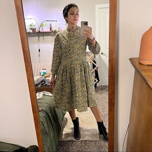 Cottage core dress. midi dress. floral print. Long sleeve. Button sleeve. Lock neck. Button front. Corduroy.