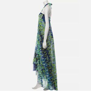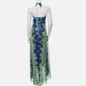 GORGEOUS, SUPER RARE, SOLD OUT, NEW $995 JEAN PAUL GAULTIER MAXI DRESS IN HIS ICONIC MESH FABRIC IN GORGEOUS BLUE/GREEN/MULTI-COLOR PAINTERLY CHEVRON PRINT WITH TIE HALTER NECKLINE. ASYMMETRIC HEM. MADE IN ITALY OF POLYAMIDE/NYLON. LINED IN COLOR-COORDINATED BLUE LINING. UBER FLATTERING, LIGHTWEIGHT MESH FABRIC. SIZE LARGE. (ALSO AVAILABLE IN XL UNDER SEPARATE LISTING). OF COURSE, THIS FABRIC ALLOWS A LOT OF LATITUDE IN THE SIZING DEPARTMENT, SO IT WILL ACCOMMODATE A SIZE SMALL TO MEDIUM.