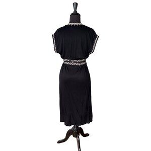 A true vintage treasure! This stunning Jiwon Park (Korean Designer) dress is a masterpiece of craftsmanship featuring intricate white/cream embroidered trim throughout. The luxurious 100% silk outer with polyester lining creates a beautiful drape and comfortable wear. Perfect for the vintage lover or anyone seeking a unique, bohemian-luxe statement piece! This dress exudes effortless bohemian elegance with a vintage romantic vibe. .