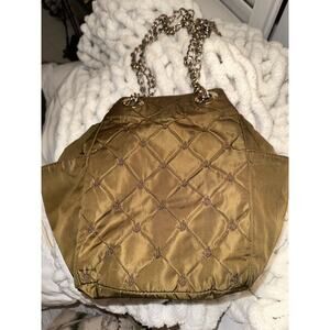VINTAGE JOAN & DAVID LARGE OLIVE QUILTED PARACHUTE BAG SIDE POCKETS CHAIN STRAP