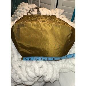 VINTAGE AMAZING CONDITION JOAN AND DAVID OLIVE GREEN SATIN QUILTED BAG. MEASUREMENTS IN PHOTOS. LARGE SIDE POCKETS! DOUBLE CHAIN HANDLE OR STRAP CAN BE CROSSBODY OR SHOULDER BAG.