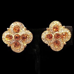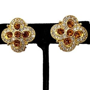 Vintage Joan Rivers gold tone clip on earrings in very good preowned condition. The earrings are clover or flower shaped with 4 amber colored crystals in the center surrounded by the pave clear crystals set in gold tone.