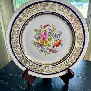 VINTAGE JOHNSON BROS. 10 3/4” DINNER PLATE. OLD ENGLISH LINE, CHADWELL PATTERN. FLORAL CENTER WITH COBALT & GOLD BORDERS, EDGED IN WHITE ROPING. IN EXCELLENT CONDITION.