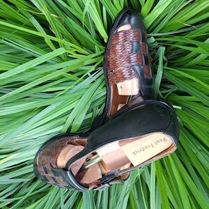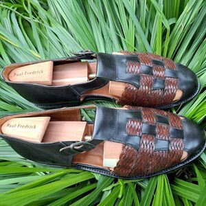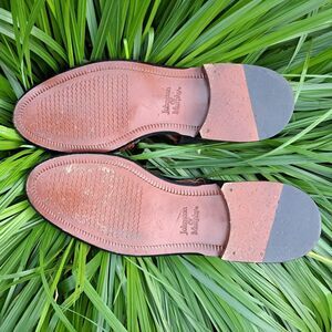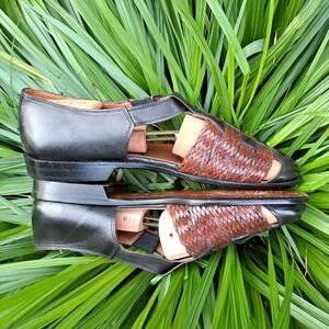 The Vintage Johnston & Murphy Tacco Leather Shoes are a stylish and high-quality option for men looking for casual footwear. Made in Germany with genuine leather, these shoes feature a unique buckle closure and a classic fisherman style. The brown and black color combination adds a touch of sophistication, while the leather lining and insole ensure comfort and durability. With a US size 11, these shoes are a timeless addition to any man's wardrobe.