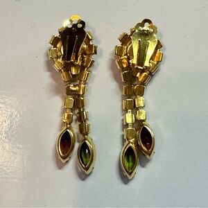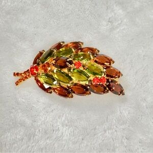Add a touch of retro elegance to your jewelry collection with this stunning vintage Juliana brooch and earrings set. Featuring a domed double symmetrical leaf design in a beautiful brown color, these dangle/drop style earrings are sure to make a statement. Made with rhinestone material and blue main stone color, they are perfect for any occasion. The set is pre-owned and was manufactured in the 1950s, adding to its unique charm. The brand is Juliana and the type is brooch & earrings. Ideal for women who love vintage and antique jewelry, these earrings are a must-have.