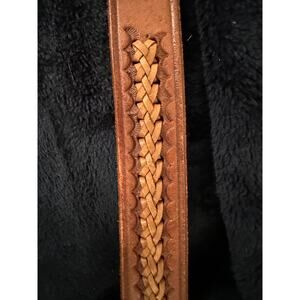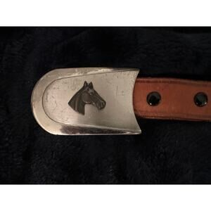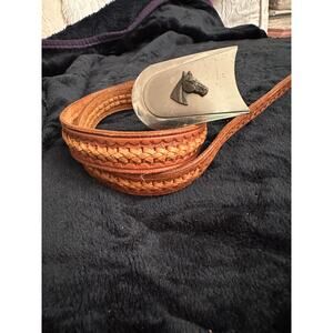 VINTAGE WESTERN TOOLED BELT WITH JUSTIN NICKEL SILVER HORSE BUCKLE. MEASUREMENTS IN PHOTOS. UNISEX.