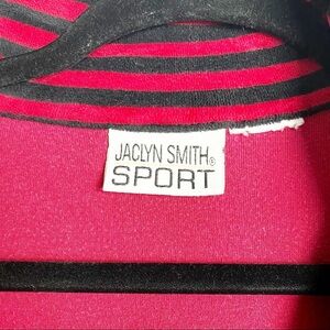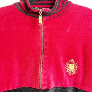 This vintage, Jaclyn Smith 1/2 zip, red & black velour pullover features gold accented hardware, embroidery and striped collar!