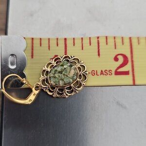 Vintage chipped jade druzy earrings in a gold tone scalloped setting.